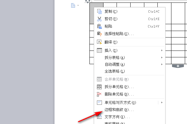3.选择表头的第一个单元格,右键单击鼠标,选择边框和底纹,如图所示。