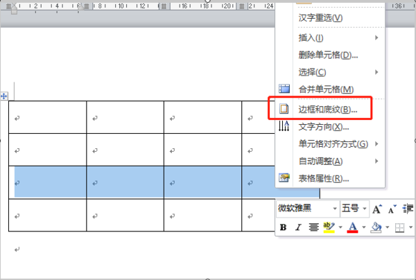 1、以Word2010版本为例,如图首先选中第三行的表格,然后鼠标右键,在弹出框选择“边框和底纹”;