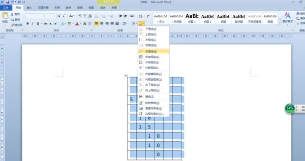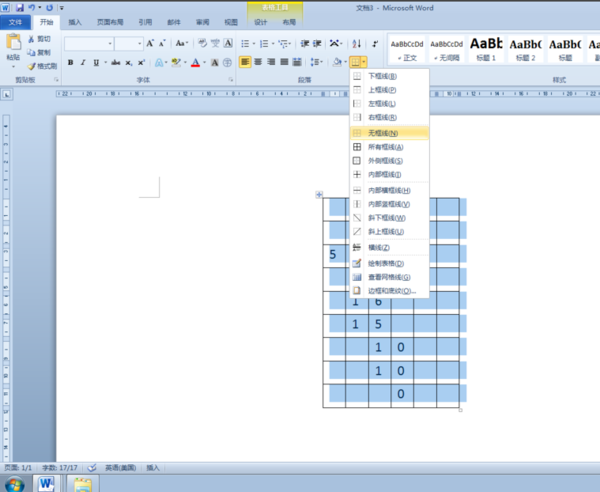 第三步:选中表格,单击“开始”选项卡,在“段落”组中单击“边框”按钮后的下拉箭头,在展开的下拉菜单中选择“无框线”。