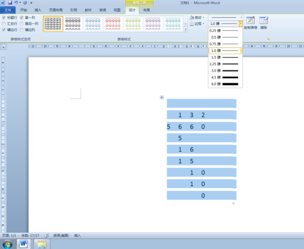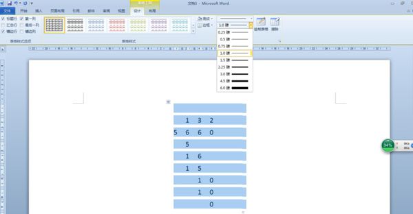 第四步:选中表格,单击上下文菜单“表格工具”中的“设计”选项卡。在“绘图边框”组中单击“笔划粗细”按钮后面的下拉箭头,选择合适的框线粗细。