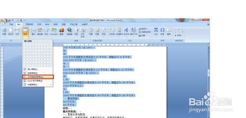 第四步:在Word2007中单击【插入】菜单,进入【表格选项卡】,选中刚刚粘贴过来的文字,单击【表格】按钮,进入表格菜单,选择【文本转换成表格】,打开【将文字转换成表格】对话框,列数选择4,文字分隔位置选择【段落标记】单选按钮,选中【根据内容调整表格】,此时可以看到表格行数自动变成6,和网页中表格行数一致,说明设置是对的。