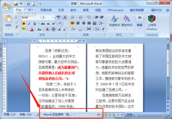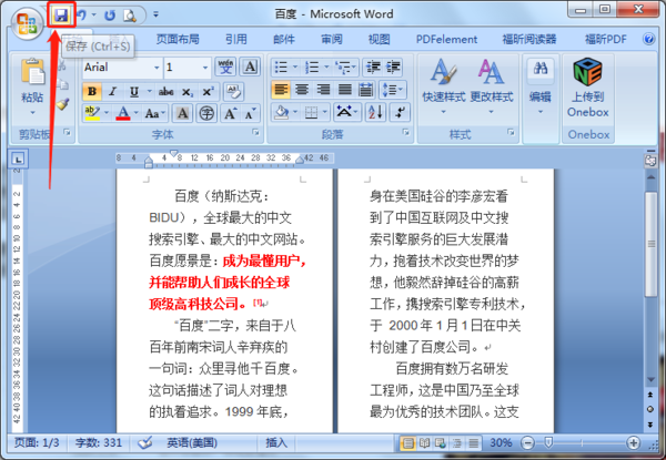 执行“保存”操作时,Word会将正在编辑的最后一次操作结果覆盖掉原先的存档,直接执行保存操作,不再弹出文件名填写对话框,文件会按照原来的设置进行存储。