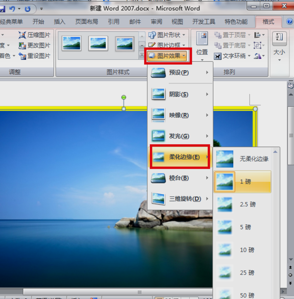 5、在“图片样式”工具栏中找到“图片效果”选项,点击进入,找到“柔化边缘”选项对图片边缘进行柔滑化设置。