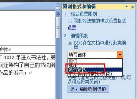 4、可以把第一项“格式设置限制”的“限制对选定的样式设置格式”选中(这项是限制样式的,可以根据实际来选,也可以不选),然后把第二项“编辑限制”中的“只允许在文档中进行此类型的编辑”选中,接着选择“填写窗体”,最后点击第三项“启动强制保护”中的“是,启动强制保护”。