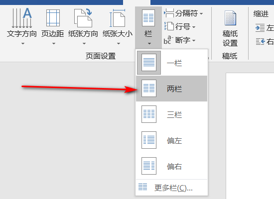 4、在随后打开的菜单中点击“栏”按钮,点击“两栏”。