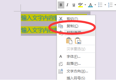 2、选中文字内容并点击鼠标右键,选择“复制”选项或者按下Ctrl+C进行复制操作。
