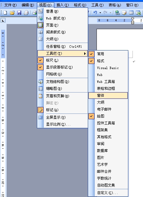 1、首先打开Word窗口,依次点击选择视图→工具栏→窗体;