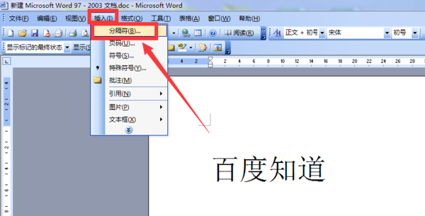 打开word文档,在第一页输入特定的内容后,想在第二页上写字,点击“插入”,选择“分隔符”;