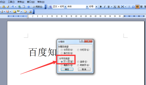 在弹出来的小窗口上,在“分节符类型”里点击选中“下一页”,然后点击“确定”的按钮;