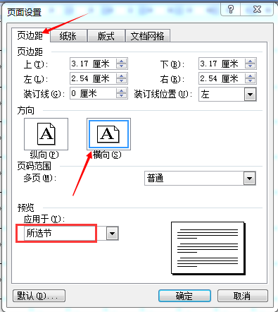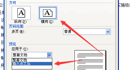 2.2在“页面设置”窗口,将“方向”设置成“横向”,将“预览应用于”设置成“插入点之后”,然后点击确定。