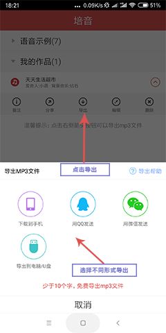 如果你想分享就可以选择分享按钮,如果你想导出,可以选择你方便的形式导出MP3格式。如果你有蓝牙音箱不必导出就可以直接播放,是不是很神奇啊,快来参与制作。