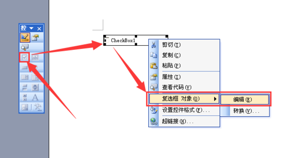 2、这时Word界面中就会出现“控件工具箱”。点击“复选框”,Word页面上就会出现一个叫标有“CheckBox1”的小方框,前面的小方框就是复选框。用鼠标右键点一下这个“复选框”,再点“复选框对象”—“编辑”,把“CheckBox1”改成需要的内容。