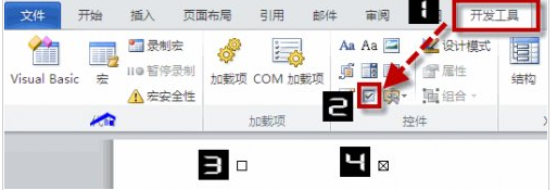 第一步,单击“开发工具”——“控件”——“复选框内容控件”,word会自动在当前光标位置插入一个复选框控件,如下图第三标识的。