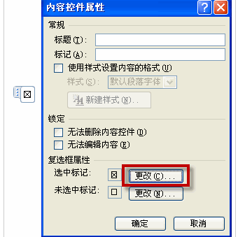 第三步,单击“属性”命令,将打开“内容控件属性”对话框,如下图所示,单击“复选框属性”的“选中标记”右边的“更改”按钮,对符号进行更改,比如需要的是勾而不是叉。