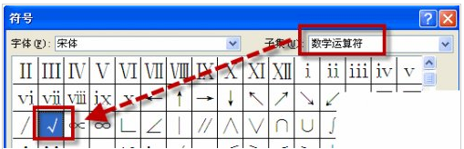 第四步,单击“更改”之后,会弹出“符号”对话框,选中“子集”的“数学运算符”下面的“√”,确定。