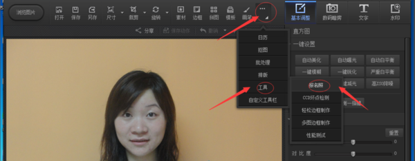 3、图片打开之后可以根据需求对图片进行基本操作如一键补光美颜调整参数等,这些参数调整完之后就可以开始制作一寸照了,点击软件界面正上方画笔旁边的直角三角形按钮在出现的功能里选择工具,在工具功能中选择报名照功能,选择制作一寸照片。