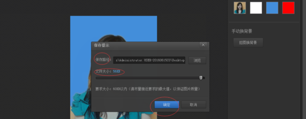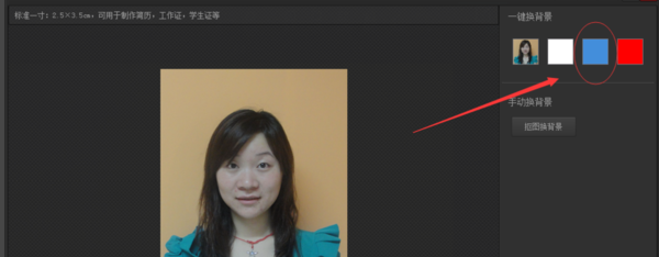 4、可以根据需求更换图片证件照背景,选择右上方的一件换背景功能,点击,连续点击两次需要的背景颜色,接着在一般情况下就可以看见页面显示图片背景已经更换成功了,最后一步就是保存了,当在保存的时候尽量把文件大小保存为最大的,避免图片太小而模糊不清。