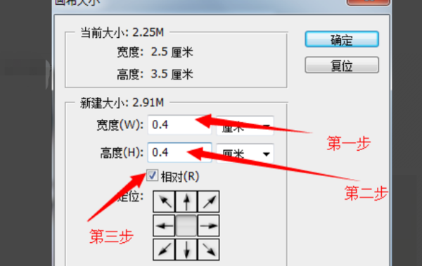 6、设置画布大小参数宽度高度各为0.4厘米 注意不要忘记点击下相对