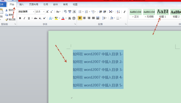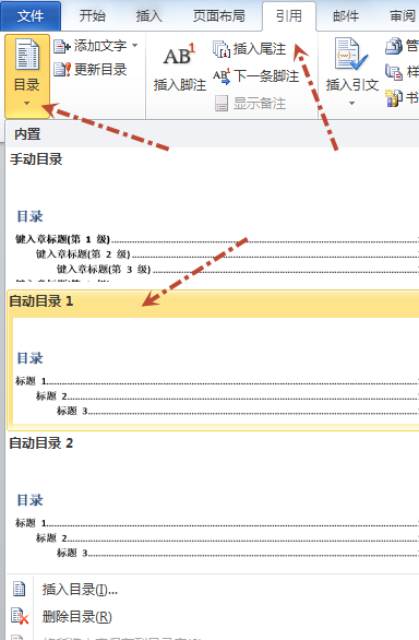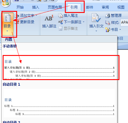 5.当都定义好后,我们就可以生成目录了。把光标移到文章最开头你要插入目录的空白位置,选[引用]--[目录]—[目录]—[插入目录]