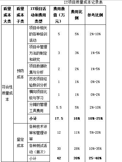 与其他行业相比较,IT项目的主要成本类型为人力成本,其成本科目构成较为单一,进行质量成本时可以将人力成本作为主要对象并折合为对应的费用,这种做法可以简化质量成本的分析过程。参考质量成本的四种类型和IT项目的特点,可以得到IT项目的质量成本分类表,如下所示。