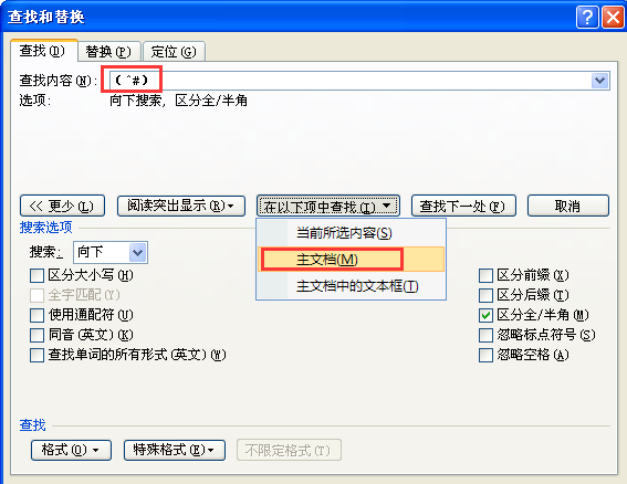 3、这相查找内容输入框中输入:^#,将其用括号括起,单击在经下项中查找----主文档;