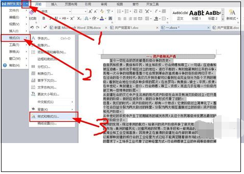 3、然后点开“wps”文字旁的小三角,选择“格式”→“样式和格式”并打开。(word文档也是找到格式→样式和格式)。