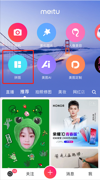 1、首先打开手机里的美图秀秀软件,在首页找到“拼图”选项,点击;