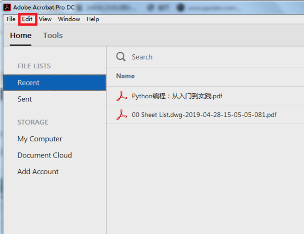 1、首先在电脑上打开Adobe Acrobat DC软件,进入软件主界面,现在语言是英语。点击上方菜单中的“Edit(编辑)”选项。