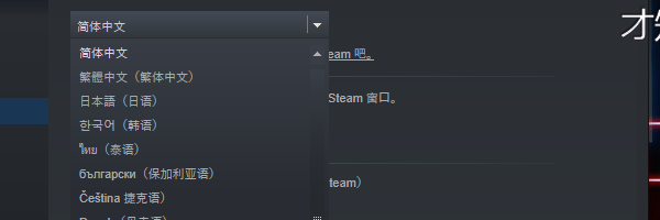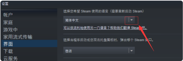 ④打开界面后,在右侧找到“简体中文”选项旁指向下方的箭头标志,并点击。