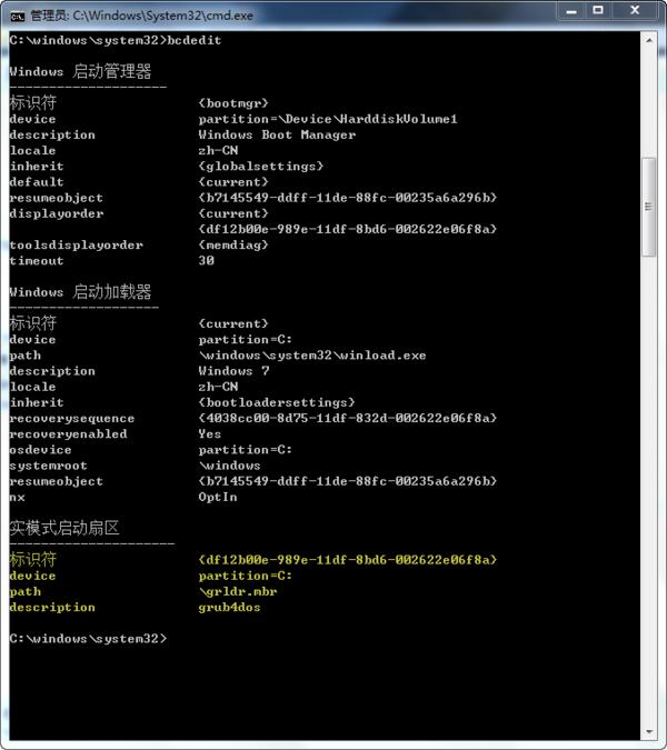 看到description后面的grub4dos了吗(黄色的字),这就是grub4dos的启动文件的信息,右键点标记并框下标识符后,右键点一下就复制了,留作下面的步骤用,我的是{df12b00e-989e-11df-8bd6-002622e06f8a}。