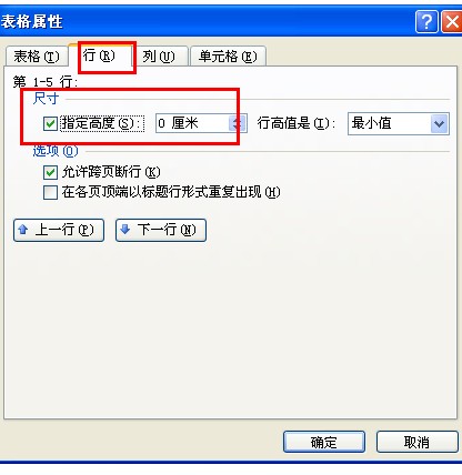4、将鼠标移动到表格左上角,右击并从弹出的菜单中选择“表格属性”项。切换至“行”选项卡,然后勾选“指定高度”项,即可精确的对所有行的行高进行设置。