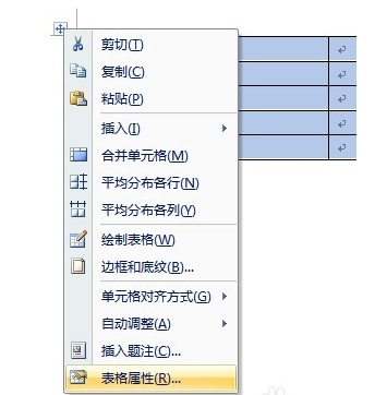 1、将鼠标移动到表格左上角,右击并从弹出的菜单中选择“表格属性”项。