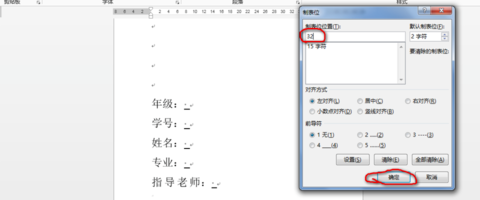 3、设置下划线左右对齐位置。点击制表位后弹出。设置下划线的左对齐位置首先在【制表位位置】输入下划线起点的位置,可以参考标尺上的数字。下划线起点以最下面的一行为准对齐,先输入15。(位置不对,以后可以再细调)然后点击【设置】(千万不要点【确定】),设置下划线的右对齐位置。重复1、的操作。小编设置右对齐为32。然后点击【确定】