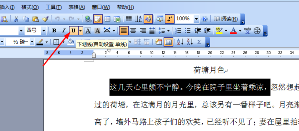 选中文字,点击格式工具栏上的下划线按钮即可。选取多少文字下划线就有多长。