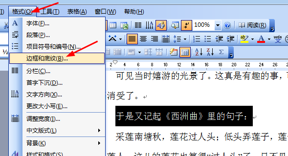 1、选中文字,依次点击“格式”-“边框和底纹”,