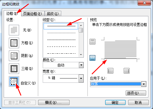 2、点击“边框”-“自定义”,选择“线型”(默认也可),应用于“段落”。在预览窗口,点击下边框。