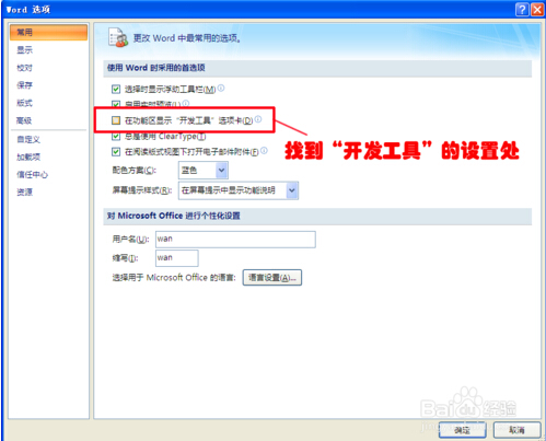 3、在“常用”设置中,找到“在功能区显示开发工具选项卡”,如下图所示: