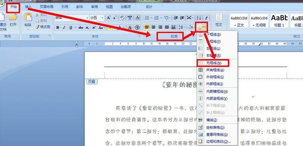 3、先将空白页眉里面的内容及下划线删除。选中文字按Delete删除,然后选中空白回车回到菜单上的“开始/段落”处,将边框设为“无边框”。