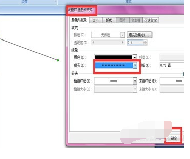 【5】这样会出来一个对话框,在“颜色与线条”选项卡里在“线条”的“实”选择一个适合的虚线,这里选择的是“短划线”。然后按确定,线条就变成了虚线了。
