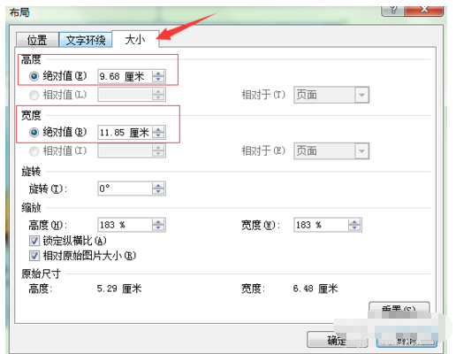 2.首先显示的是”大小“选项卡,从里面可以手动修改图片的尺寸大小,使它适合文档的需要。