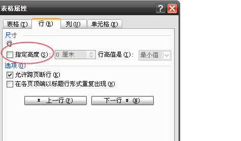 2、经常,设置好了“允许跨页断行”,Word 表格文字依然无法自动换页,则有可能是由于有人给单元格设置了固定行高所导致的。解决方法的操作同上,只要把表格属性设置中的行尺寸的“指定高度”前面框框里的勾去掉即可(如下图所示)。