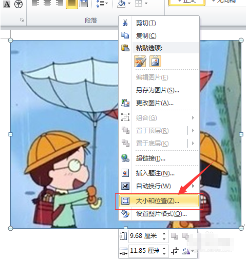 1.打开word,选中图片,右键选择”大小和位置“选项。