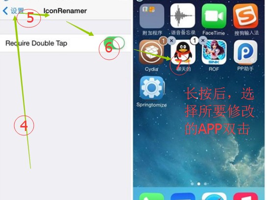 随后我们在主屏上长按任意主屏图标3秒左右,进入主屏编辑模式。用手指双击一个想要修改名称的图标。