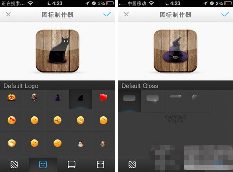 除了可以分别对图标的底图、Logo、边框以及玻璃高光效果这四种元素进行组合之外,还可以通过相册或相机直接导入自定义底图。个人建议,这时候只选择底图和玻璃高光效果即可,生成效果非常不错。如果再加入系统自带的logo和边框,反而有画蛇添足的不协调感。