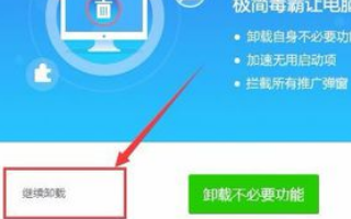 5、然后就打开了金山毒霸的卸载程序了,在这里大家一定要看清楚,因为有很多误点的操作而让金山毒霸卸载不干净。在第一个卸载页面要点击如图的继续卸载,而不是中间那个大图标的卸载不必要的功能。