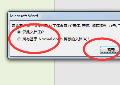 4、然后在弹出的提示“是否要为以下文本将默认字体设置为”可以选择“仅此文档或者所有文档”,点击确定按钮即可完成默认设置。