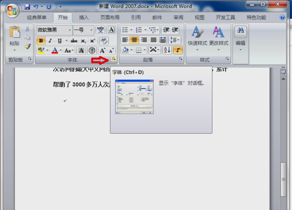 1、首先打开Word文档,点击“字体”选项卡右下角的方框图标。