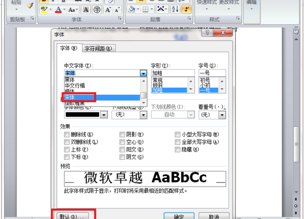 在word的字体对话框中可以设置默认字体为宋体,具体操作请参照以下步骤。