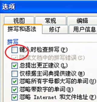 2、弹出选项对话框,选择拼写和语法选项卡,单击键入时检查方法复选框,去掉其中的对勾即可,如图所示。
