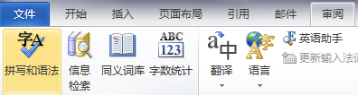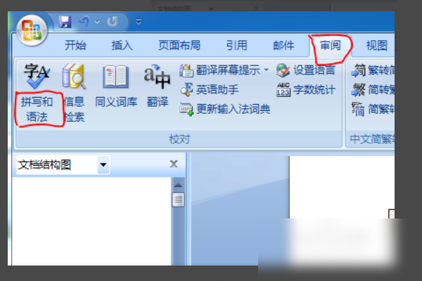 1、首先我们选择鼠标单击word2007菜单栏中“审阅”下的“拼写和语法”功能选项。